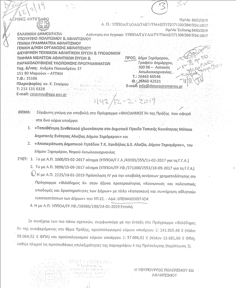 Όπως προκύπτει και από το υπ.αριθ πρωτ. 1142/12-02-2019 έγγραφο στο Δήμο Ξηρομέρου από τον τότε Υφυπουργό Κ Βασιλειάδη .