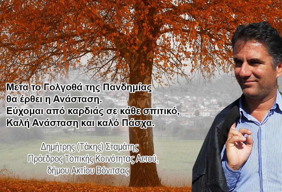 Ευχές Προέδρου ΑΕΤΟΥ Ξηρομέρου κ. Τάκη Σταμάτη για το Πασχα 2020 Θέματα:xiromero newsxiromero pressxiromeronewsxiromeropressΞηρόμερο Νέα Συντάκτης: admin 17 Απριλίου, 2020 Μετα το Γολγοθά της Πανδημίας θα έρθει η Ανάσταση. Εύχομαι από καρδιάς σε κάθε σπιτικό, Καλή Ανάσταση και καλό Πάσχα. Δημήτρης (Τάκης) Σταμάτης Πρόεδρος Τοπικής Κοινότητας Αετού, δήμου Ακτίου Βόνιτσας Άρθρο από:ΞηρόμεροNews
