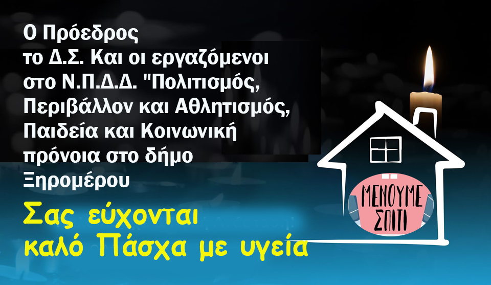 Καλό Πάσχα απο το ΝΟΜΙΚΟ ΠΡΟΣΩΠΟ Ν.Π.Δ.Δ. του ΔΗΜΟΥ ΞΗΡΟΜΕΡΟΥ Θέματα:xiromero newsxiromero pressxiromeronewsxiromeropressΞηρόμερο Νέα Συντάκτης: admin 14 Απριλίου, 2020 Ο Πρόεδρος, το Δ.Σ. και οι εργαζόμενοι στο Ν.Π.Δ.Δ. “Πολιτισμός, Περιβάλλον και Αθλητισμός, Παιδεία και Κοινωνική πρόνοια στο δήμο Ξηρομέρου, Σας εύχονται καλό Πάσχα με υγεία… Άρθρο από:ΞηρόμεροNews