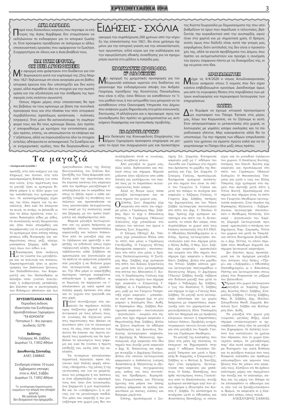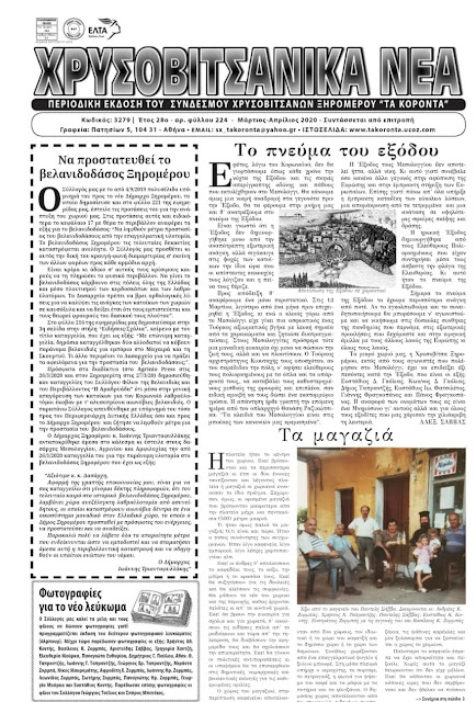 Με ποικίλα και ενδιαφέροντα θέματα μόλις κυκλοφόρησε τo 224 φύλλο της εφημερίδας «Χρυσοβιτσάνικα νέα», Μάρτιος – Απρίλιος 2020 που εκδίδει ο Σύνδεσμος Χρυσοβιτσάνων Ξηρομέρου «Τα Κόροντα».