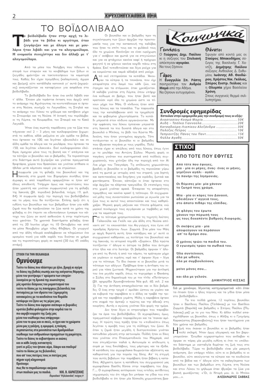 Στην εφημερίδα περιλαμβάνονται Τα μαγαζιά, Bελανιδιά, αναμνήσεις, Προτάσεις για την προστασία και ανάδειξη του Βελανιδοδάσους του Ξηρομέρου, Ομνύουμε,ΤΟ ΒΟΪΔΟΛΙΒΑΔΟ,