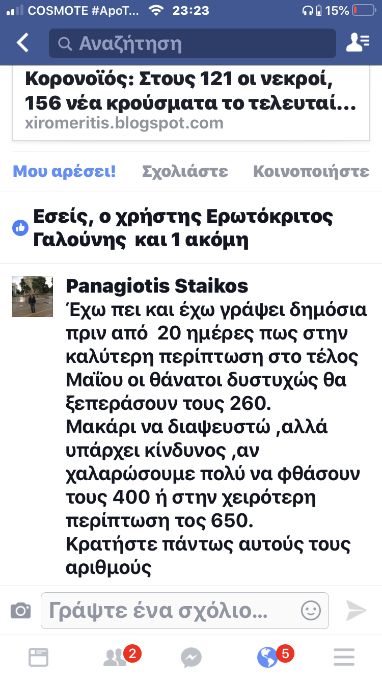 Είχα επισημάνει όταν οι θάνατοι από τον Covid19 ήταν περίπου 35 ακόμη ,πράγμα το οποίο επανέλαβα και αργότερα , όπως προκύπτει και από την φωτογραφία ,όταν ήταν 121 , πως αν πάνε όλα πολύ καλά , όπως πήγαν από την πρώτη ημέρα δυστυχώς στο τέλος Μαΐου στην καλύτερη περίπτωση θα φτάσουν οι νεκροί τους 260, χωρίς να αποκλείεται το 400 δυστυχώς και εύχομαι μακάρι να μην επαληθευτεί αυτό , το οποίο δεν είναι ,ότι κάνω τον μάντη κακών , αλλά είναι ανάλυση από τον Φεβρουάριο με βάση Στατιστικά μοντέλα από την Βοστόνη των πιο διάσημων Ειδημιολόγων- Στατιστικολόγων του κόσμου και εύχομαι ολόψυχα μακάρι να μην έχουμε ούτε έναν άλλο , αλλά δυστυχώς όπως είδατε πέθανε ακόμη και νεότατος άνθρωπος μόλις 35 χρονών απόλυτα υγιής , γι αυτό μέχρι να εμβολιαστούμε, είμαστε εν δυνάμει και όλοι εμείς ακόλουθοι .